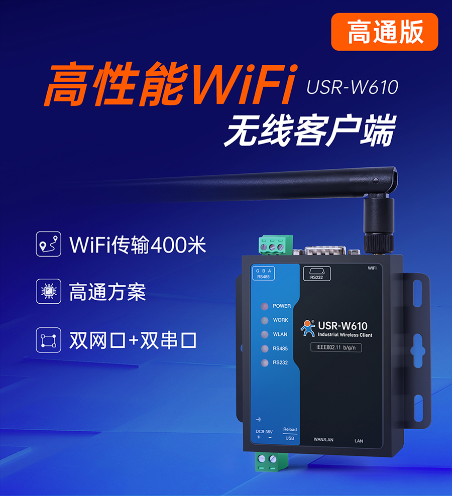 高性能WiFi无线客户端-高通版 USR-W610(高通版)是一款使用高通方案打造的WiFi高性能串口服务器,具备WiFi传输远、广连接、低时延、高稳定的特点,支持2.4G WiFi,802.11 b/g/n无线协议、以太网端口(1WAN/L...