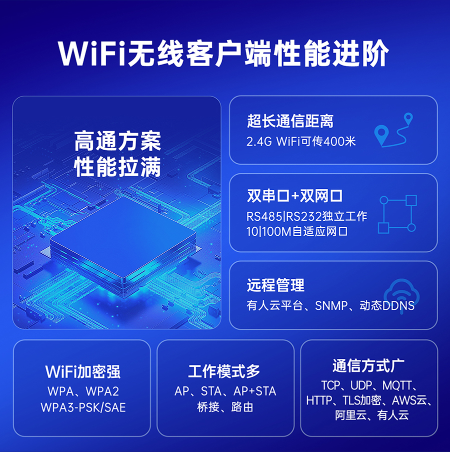 USR-W610(高通版)是一款使用高通方案打造的WiFi高性能串口服务器,具备WiFi传输远、广连接、低时延、高稳定的特点,支持2.4G WiFi,802.11 b/g/n无线协议、以太网端口(1WAN/LAN+1LAN)、RS232+RS485、支持STA/AP/AP+STA/桥接/路由方式,端口转发,可为不同场景、不同行业提供稳定可靠的组网方案。
